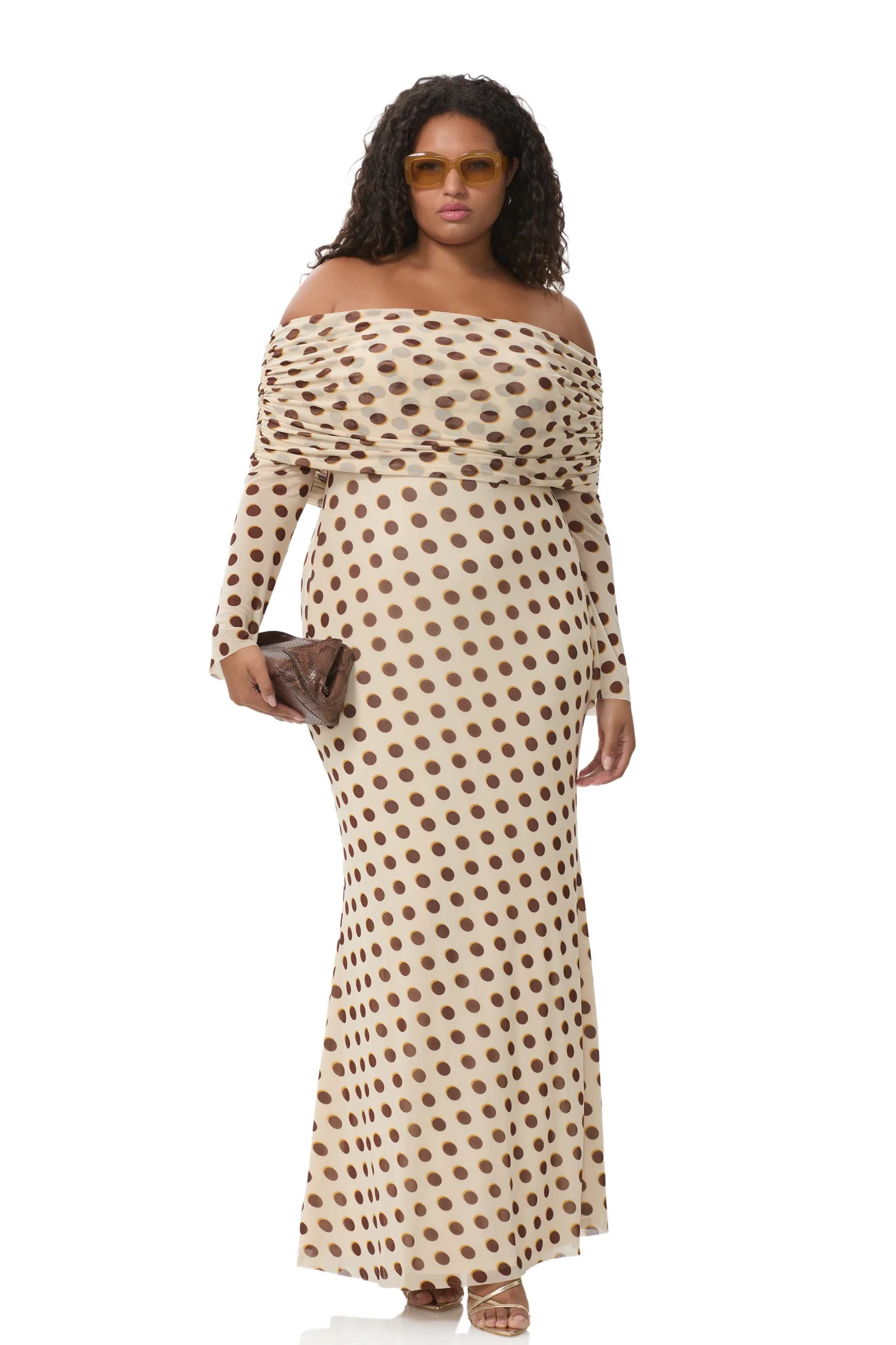 With its off-shoulder neckline, gathered detailing and signature Gold Halo Dot mesh, Thelma delivers effortless drama with a flattering, feminine fit at every stage.