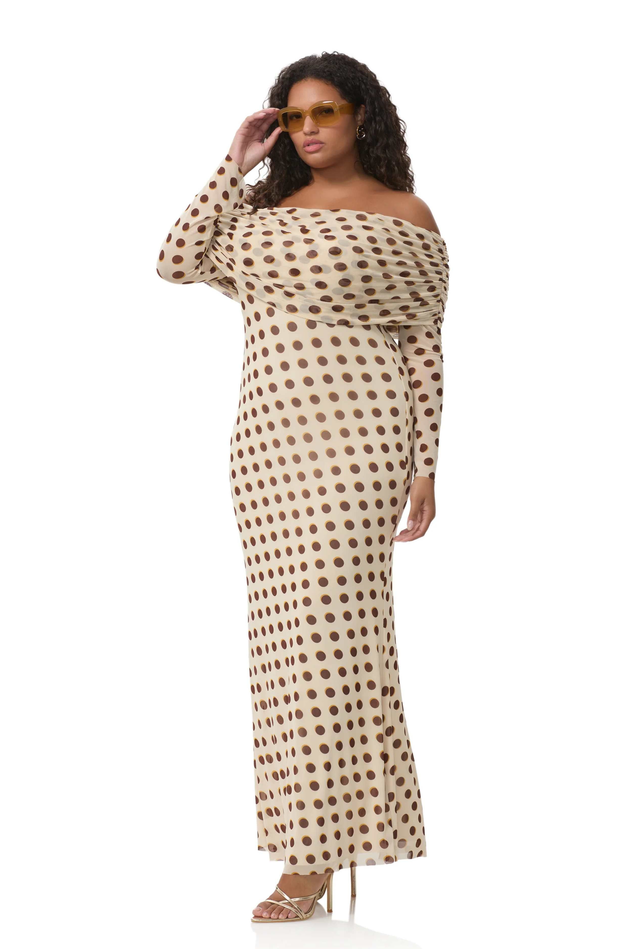 With its off-shoulder neckline, gathered detailing and signature Gold Halo Dot mesh, Thelma delivers effortless drama with a flattering, feminine fit at every stage.